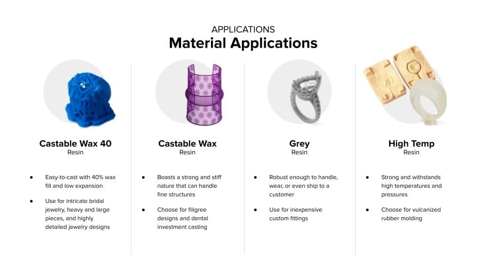 Castable Wax 40 Resin 易于铸造,广泛支持各种设计,而且有完备的 3D 打印生态圈提供支持。其设计可无缝融入数字化 3D 打印工作流程,让您能轻松创建和迭代设计并加以留存。体验 Castable Wax 40 Resin,将您最前卫的珠宝设计变为现实。