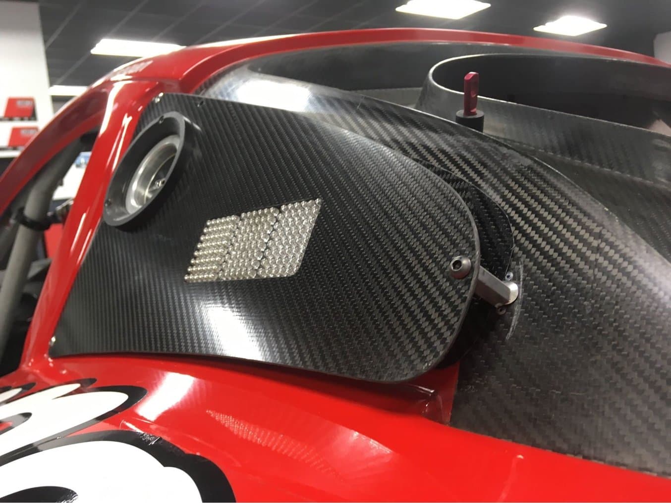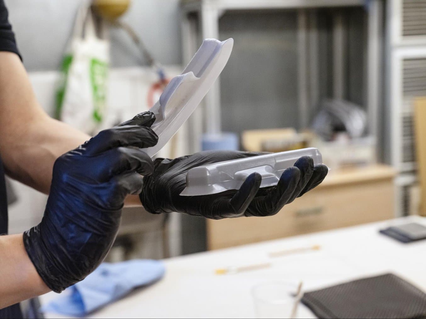 由 DeltaWing Manufacturing 生产的碳纤维挡泥板风管,旁边是由 High Temp Resin 打印的两片式模具。