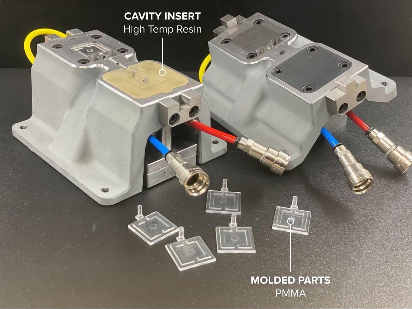PMMA 汽车组件的注射成型模具,模具镶件由 High Temp Resin 打印而成。