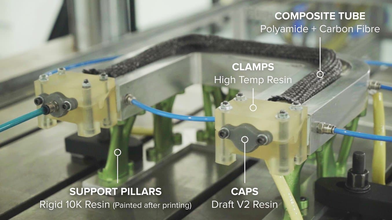 近期该团队开发的复合材料管正是制造工具的实例之一。他们使用 Rigid 10K Resin 生产工具的支柱(需要具备高刚度),使用 High Temp Resin 生产夹钳(需要耐高温和气压),并且使用 Draft Resin 快速生产工具的端盖。