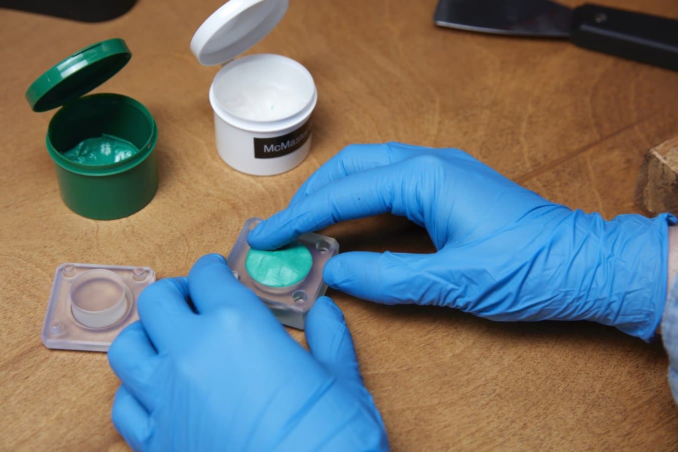 OXO 工程师在 Formlabs SLA 3D 打印机中使用 Clear Resin 制作模具。在完成部件清洗和固化后,即可准备用于压缩成型。在模具内表面涂抹脱模剂。接下来,制备好硅胶腻子后,将其放置在底部模具中。