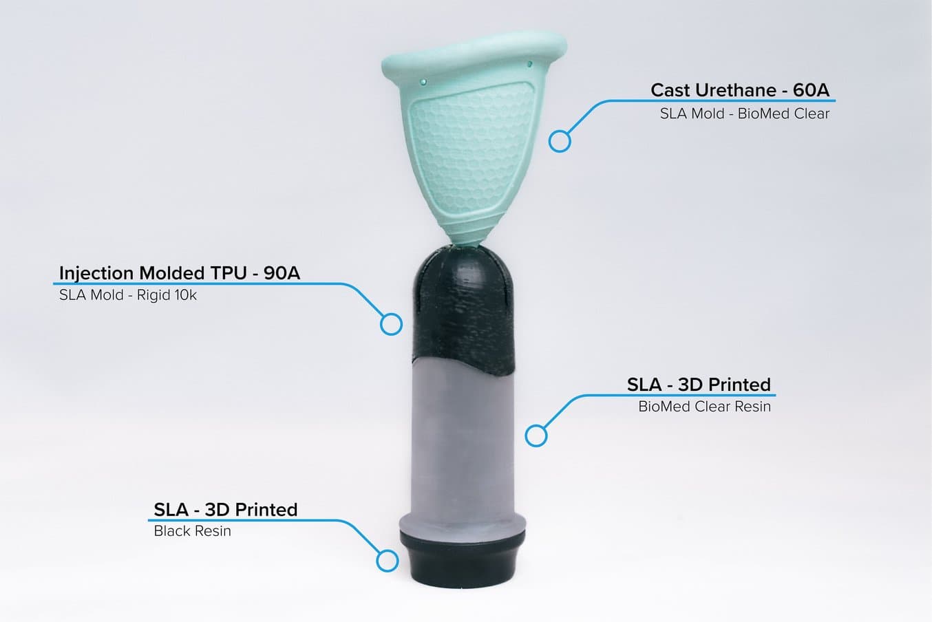 Glassboard 对这类产品有所了解:这是一种用于人体的柔性消费品,需要制造大量的原型并进行多次测试。因此 Chapman 求助于他最可靠的队友 - 两台 Formlabs SLA 3D 打印机,并开始使用 Elastic 50A Resin 和 Flexible 80A Resin 进行打印,以模拟该月经杯。