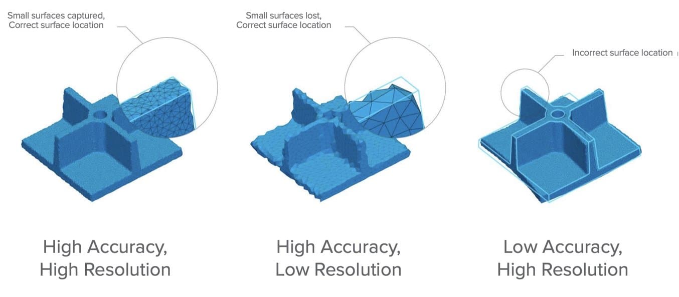 除了测量点与其实际位置之间的精确度外,扫描仪的分辨率也有所不同,即在固定扫描距离下捕获点之间的距离。这意味着扫描对象上小于扫描仪分辨率的细节将无法被捕捉。例如,具有较低分辨率的高精度 3D 扫描仪可能会检测到雕像上珠宝的一般形状,但无法清楚地显示戒指或项链上的个别细节。根据您的项目要求,这可能会也可能不会影响交付。