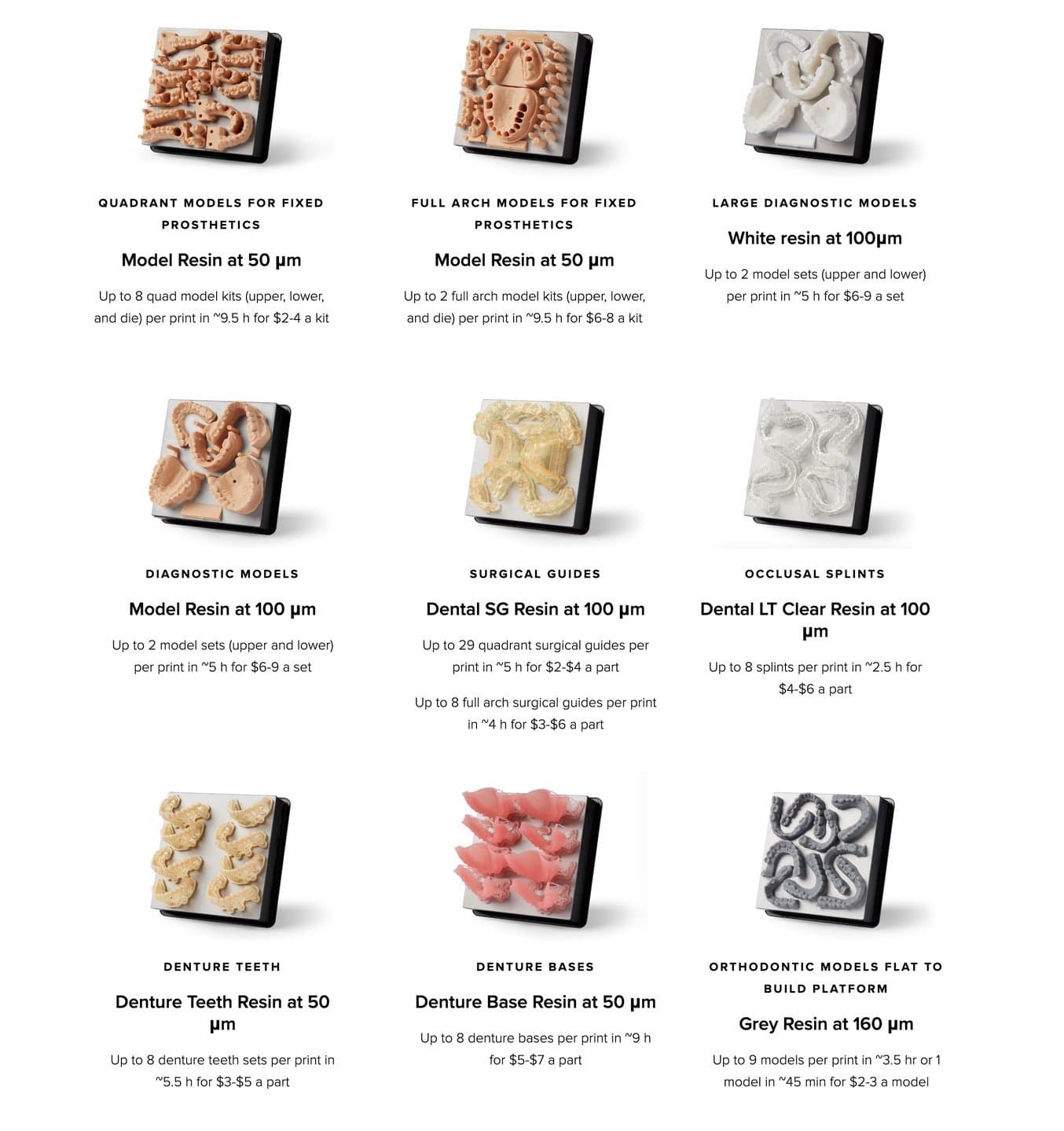 材料的选择因具体的打印机型号而异。一些基础型号的 3D 打印机只能用于生产诊断模型,较为先进的系统则可以用于生产高精度的牙冠和牙桥模型、手术导板和可浇注/可压制修复体;而耐久型生物相容性牙科产品(如夹板、保持器或数字义齿)以及正畸器具(如透明矫正器和霍利保持器)则可以通过 3D 打印模型热成型的方式进行生产。